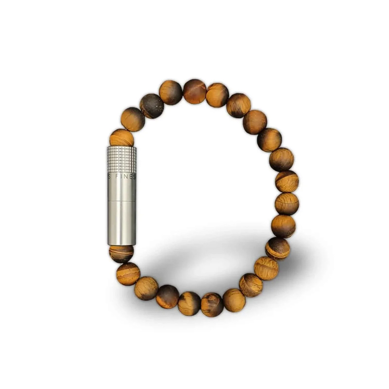 Le Punch Bracelet SOLO STEEL Connoisseur Matte Tiger Eye conçu par Les Fines Lames est le premier accessoire cigare qui se porte comme un bijou. Fabriqué en France par une marque française, c’est un bracelet élégant et tendance qui recèle un poinçon de cigare de 7 mm en acier inoxydable 316L. Cette double fonctionnalité vous permettra de toujours avoir votre coupe-cigare sur vous tout en affirmant votre style.